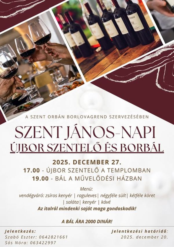 A hagyományos János-napi borszentelő után szeretettel várjuk a szórakozni vágyókat. Vendégváró zsíros kenyér, a vacsora: raguleves, négy féle sült, két féle köret és saláta.